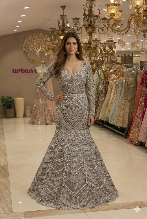 Silver Sequined Mermaid Gown with Long Sleeves โ Glamorous Indian Evening Wear